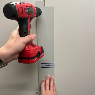 Step 2: Use a cordless drill to secure StallPlus+ to the door or partition with included screws.