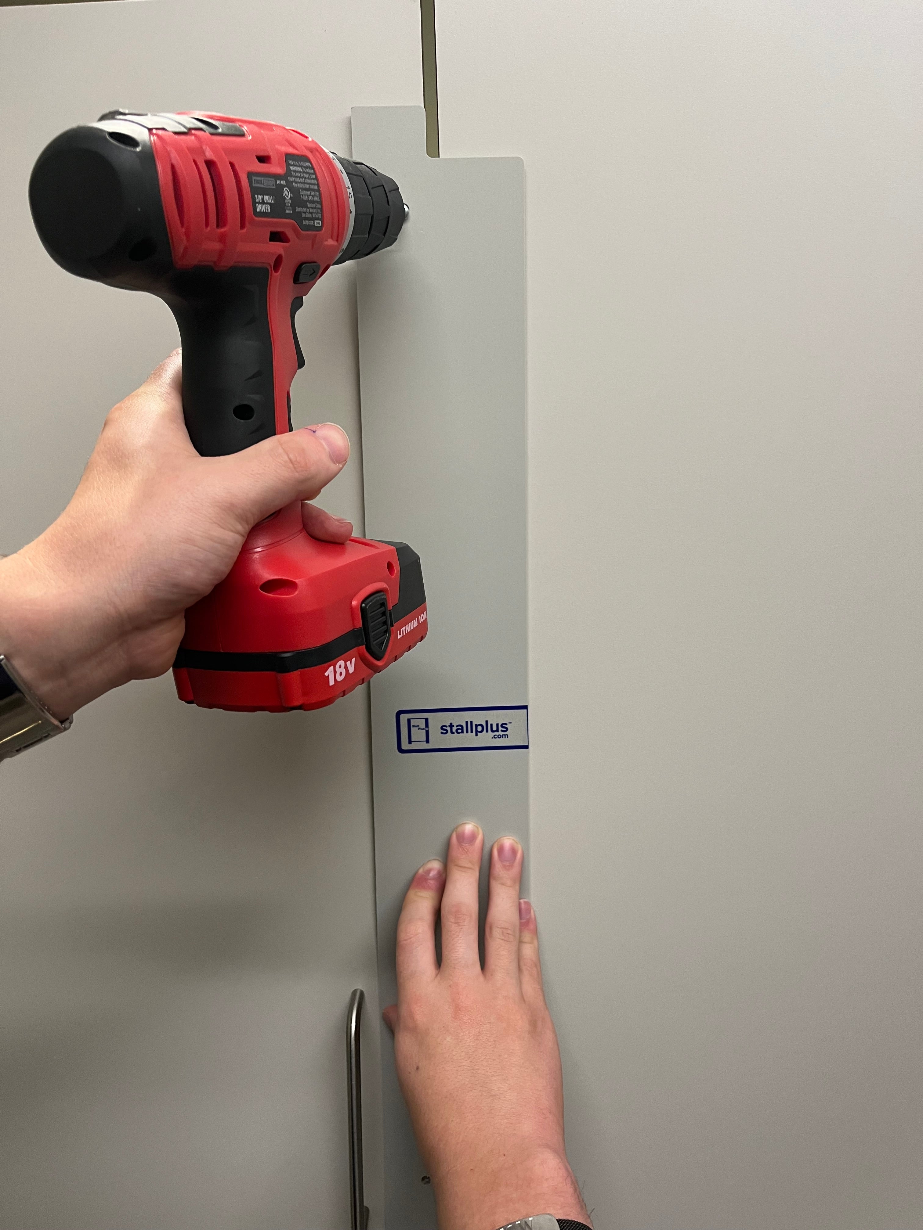 Step 2: Use a cordless drill to secure StallPlus+ to the door or partition with included screws.