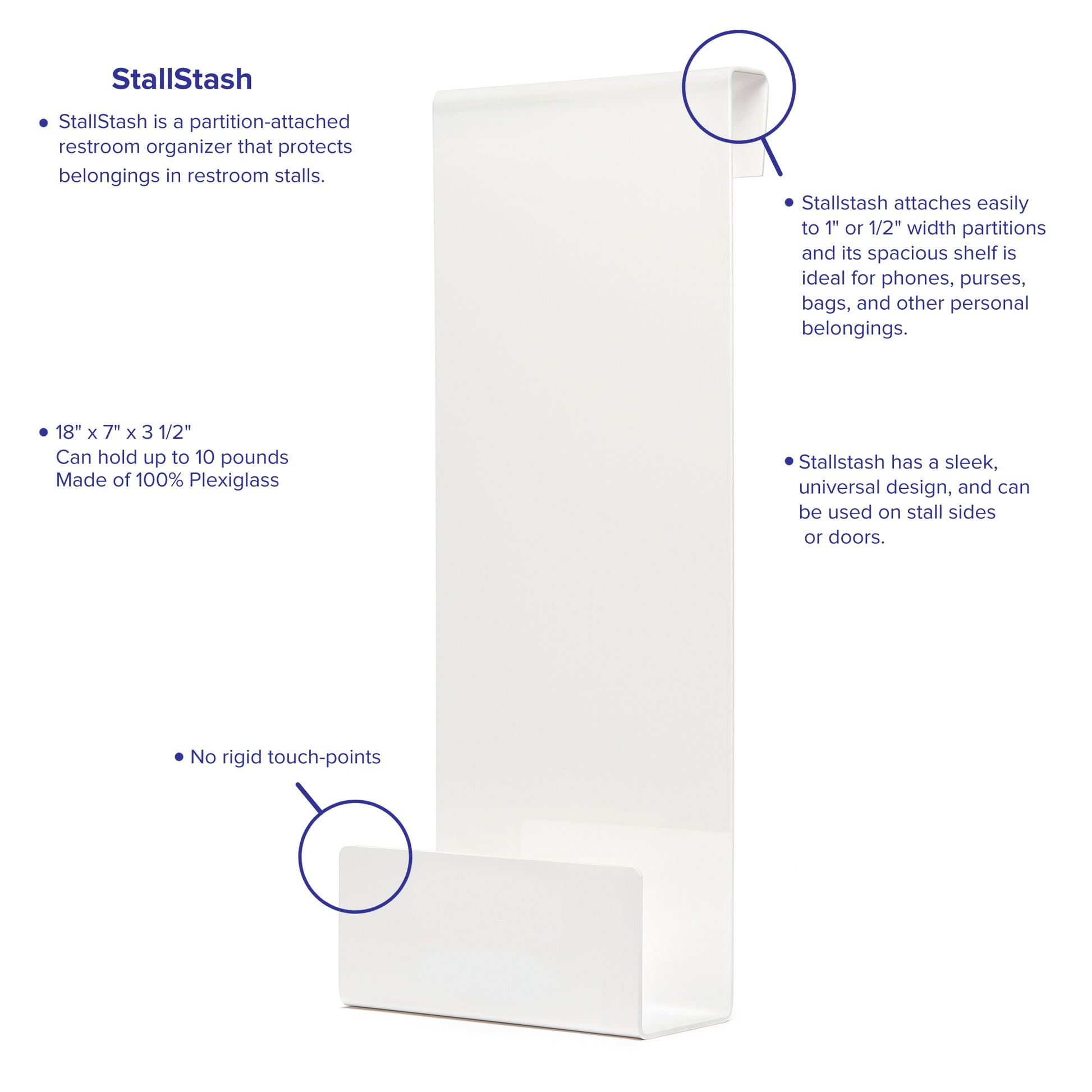 - EASY TO MAINTAIN: StallStash Restroom Organizers are made of 100% Plexiglass and can be easily cleaned and maintained with a microfiber towel.